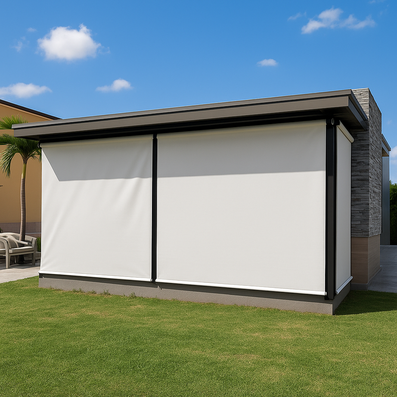 Solución moderna para interiores y exteriores, combinando protección solar y diseño minimalista.